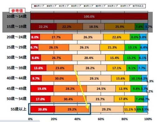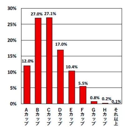 近年、女性の胸の肥大化が話題なんで、相当に大きくなってるかと思えば各年代を平均するとやはりというかBカップとCカップで半数越え。巨乳化してるのは30代までの比較的若い層なのでしょうね。