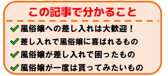 風俗嬢への差し入れは全然OKなんです!ですが差し入れるものによっては喜ばれたり困らせてしまったり、怖がらせてしまったりします。女の子たちへプレゼントしたら喜ばれるもの、嬉しいもの、こんなものをもらった嬢がハッピーな気分になれるアイテムを紹介します。