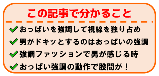と、男の性的な嗜好はさまざまなので、太もも、髪、襟足などなどいろいろなパーツでドキッとするのですが、中でもダントツに訴求力の高いのがおっぱいです。