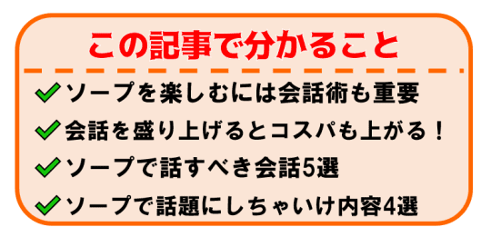 ソープ嬢に聞くと、会話が続かず気づまりな時間を過ごす客って意外と多いそうです。どうせヤルだけと思っていても、会話が弾むか否かでサービスの質に影響してくるとしたらどうします?今回の記事で会話の質を高めつつ、ソープのコスパも高めていきましょう!