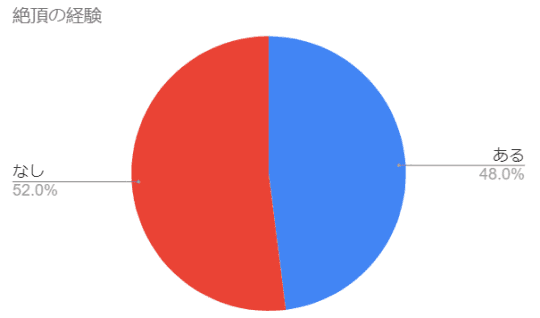 この結果は、性に関する調査をしている某企業が2000名を対象に行ったものです。グラフを見ても分かるように、絶頂の経験がある女性は若干ですが半数以下であることが分かります。すべての女性が絶頂を感じるわけではないので焦る必要はありません。