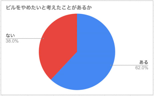 ピルを継続して服用している方に「ピルをやめたいと考えたことがある?」という質問をしてみたところ、62%という半数以上の方がやめてみようかと考えたことがあるという回答をしています。