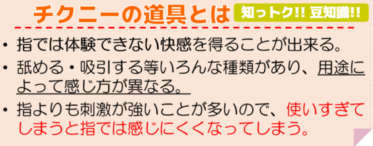 吸引したり、細かな毛先で先端を刺激したり、振動を与えたり…。道具の数だけチクニーで楽しめる快感はどんどん増えていきます。