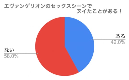 「エヴァンゲリオンのセックスシーンでヌイたことがある?」という質問をエヴァンゲリオン好きのコミュニティ約1500人に答えてもらったところ…になんと「42%」もの方がヌイしまった!という衝撃の回答が出ています。(このグラフはエヴァンゲリオン好きのコミュニティ約1500名の方に向けてアンケートを取ったものです。)