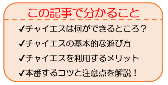 まずはチャイエスについて、あまり詳しくご存じない方のためにそもそもチャイエスのサービス内容がどんなものなのかを解説していきたいと思います!