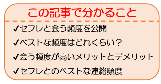 ただ、あくまでも情が移ったり依存しないベストな頻度なだけなので、お互いに絶対にそんなことがない!と言えるので、あればベストな頻度などは気にせず無理しない程度に会うのがいいでしょう。