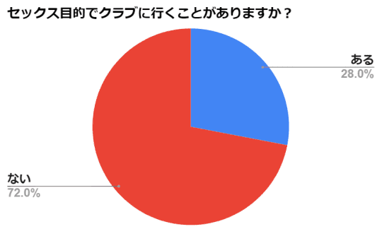 28%の女性がセックス目的でクラブに行くという結果に。結構多いですね。10人中2~3人はセックスされてもいいと思っているわけです。