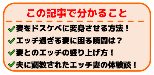他人の妻を見てエッチな人だな〜って、感じる男性は多いです。自分の妻のことをエッチな女に見ようとしていないだけで、自分の妻も実は、エッチな部分はあります。旦那次第で簡単にエッチな女に調教できるので、今回はあなた好みのエッチな妻の作り方をご紹介していきます。
