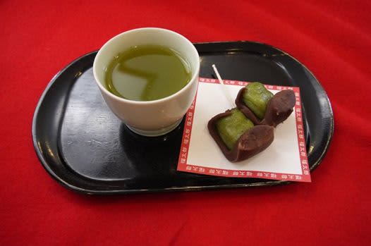 この独特の形は、三嶋神社で毎年行われる五穀豊穣を祈る狂言形式の祭事のお田打ち祭に登場する福太郎をイメージして作られました。烏帽子を被った黒い面姿を模した餅菓子で、見方を変えればリーゼント姿の男性に見えるので俗称でリーゼント餅と呼ばれることもあります。12個入り920円とお買い得でばらまきにもぴったりの商品です。