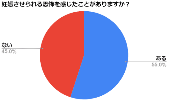 さらにこちらは、妊娠まではしていないけれど妊娠させられてしまうかもと恐怖を感じたことがあるか?という質問の結果です。