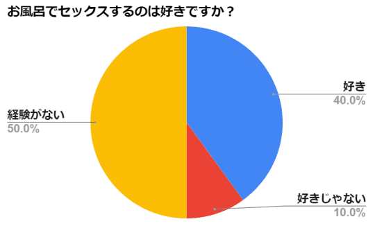 お風呂でセックスしたことがないという女性が半分もいましたが、経験したことがある女性はほぼお風呂でのセックスが好きと回答していました。