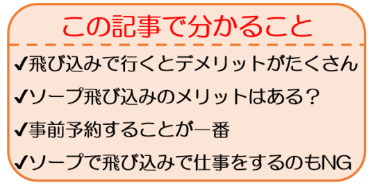 対して飛び込みでソープに行くメリットがなくはありません。予約する手間が省けるというのもメリットのひとつでしょう。