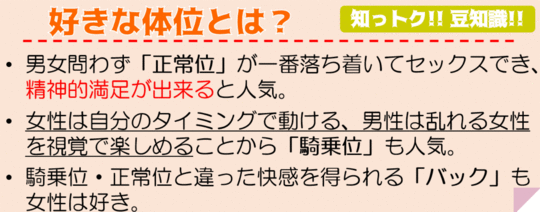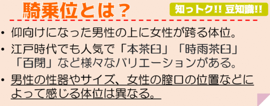 座位も女性が男性の上になり、比較的主導権を握ることができる体位となっています。