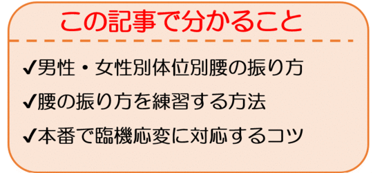 では具体的にどのような腰の振り方に気をつけながら練習していくべきなのかを、男女別でわけながらご紹介していきます。