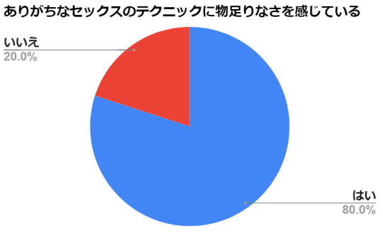 ネット上で都内に住む20代30代男女300人に「ありがちなセックスのテクニックに物足りないと感じたことがあるか」という質問をしたところ、こんな結果になりました。