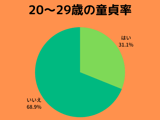 20代は、人口約195人のうち「31.1%」の方が童貞と回答しています。10代から比べてるとかなり減ったのではないでしょうか。