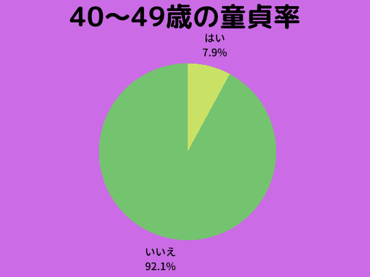 40代は、なんと「7.9%」の方がいまだに童貞だという結果になりました。これはとても深刻です。