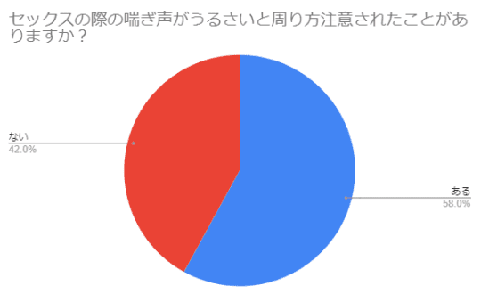 上記のグラフは男性女性100人に「セックスの際の喘ぎ声がうるさいと周り方注意されたことがありますか?」というアンケートを取った際の結果になります。