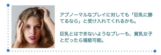 少しアブノーマルなプレイに対しても「巨乳に勝てるなら」と受け入れてくれるでしょう。巨乳とはできないようなプレーも、貧乳女子とだったら堪能することができるんですよ♡