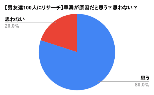 100人の男友達に「オナニーが長くできない理由は早漏だと思う?思わない?」でリサーチしてみたところ、80%の人が「早漏が原因」と回答してくれました。