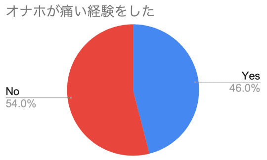 上にあるグラフは、筆者の後輩たち20代~30代の男性50人にメールを送ってアンケートを取ったところ、実に46%の男性がオナホを使っていて『痛い』という経験をしたことがあるとわかりました。