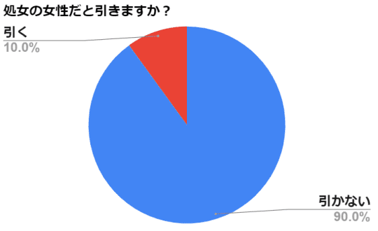 女性たちが心配しているのとは真逆で、引かないという答えが9割を占めました。女性が考えているより男性は処女かどうかを重要視はしていないようです。
