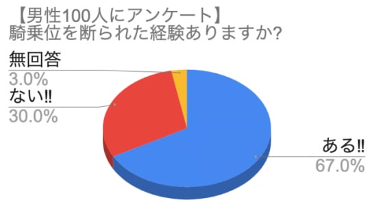 アンケートの結果、騎乗位が恥ずかしいと断られた経験のある男性は約67%でした。