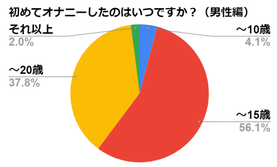 男性の半数以上は15歳まで、つまり中学生のうちに初オナニーを済ませているようです。20歳になるまでにはほぼ9割の男性が経験しています。