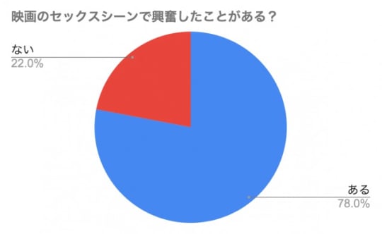 Twitterで映画好きの男女100名に「映画のセックスシーンで興奮したことある?」の質問したところ、半数以上の78%の方々が映画のセックスシーンで興奮してしまった経験を持っていると回答して下さいました。