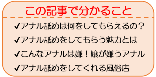 しかし、アナル舐めを目的に来ているお客さんにとっては、「アナル舐めしてくれないの?」とがっかりしてしまう結果にもつながります。そこで、アナル舐めを確実にして欲しいならアナル舐めを高い確率でしてくれるお店を選びましょう。