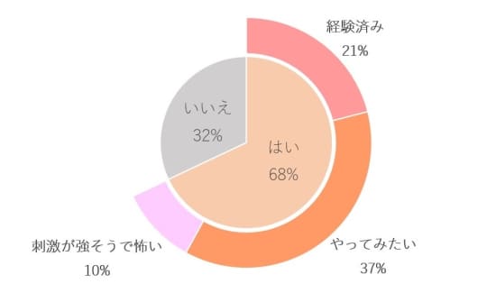 まんなかの円グラフが、Q1の回答。その周りが、ハッカ油オナニーを知っている人に対するQ2の回答です。知名度は低くないものの、意外と「気になるけれどやったことは無い…」という人が多いことが分かります。