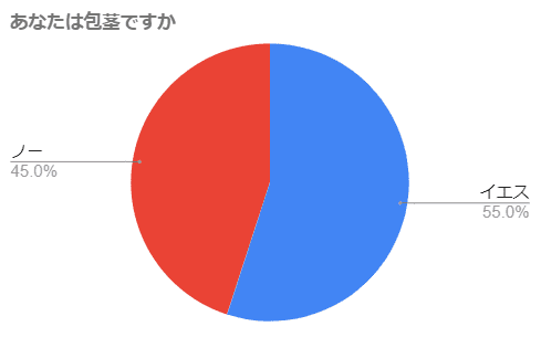 今回は男性100人を対象に「あなたは包茎ですか」とアンケートを取ってみました。皆さん恥ずかしながらも、アンケートに答えてくれましたよ。結果は上記の通りです。