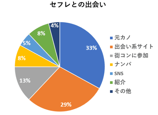 グラフよりセフレ関係となったのは、元カノが33%でトップとなっています。続いて2位に出会い系サイトが29%で続き、街コンが13%で3位となっています。