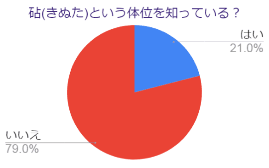 「砧という体位を知っている?」という質問に「いいえ」と答えた人は全体の8割近くにも及び、80人中63人が知らないとのことでした。