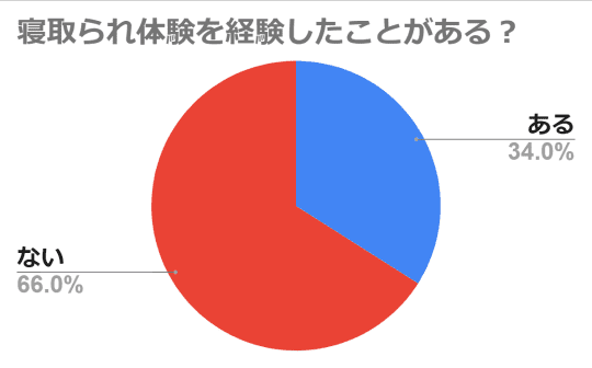結果からわかるように、寝取られ体験をしたことがある方は全体の3割程存在しており、逆に寝取られ体験をしたことがない方は6割程存在します。