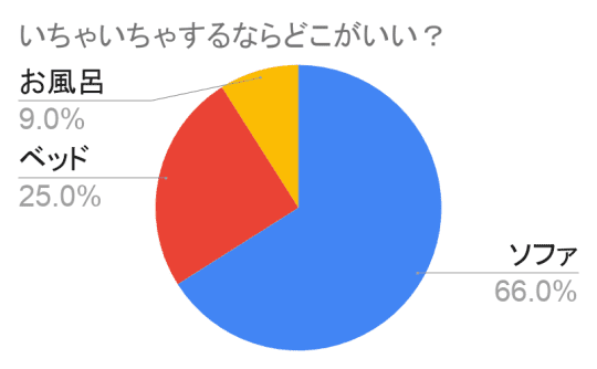 ご覧の通り約70%の女性が「ソファ」と答えており、ソファでのいちゃいちゃタイムが圧倒的に人気だということがわかります。