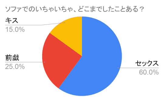 「セックスまで」と答えた人は60%、「前戯まで」と答えた人は25%おり、ソファでのいちゃいちゃはセックスに持ち込みやすいこともわかります。