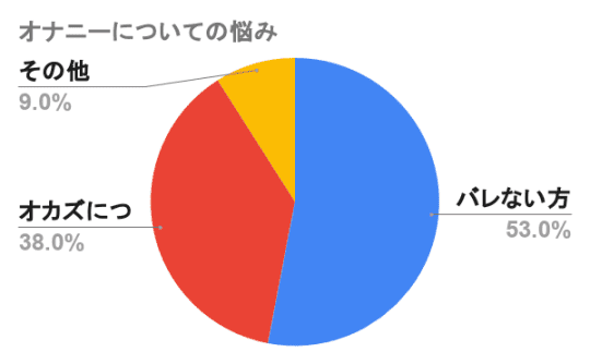 その結果、バレない方法が53%と半数を占めているのが分かりました。後はオカズについてが38%、見つかってどうしたらいいか分からない・やりすぎている気がする、といったその他が9%となりました。