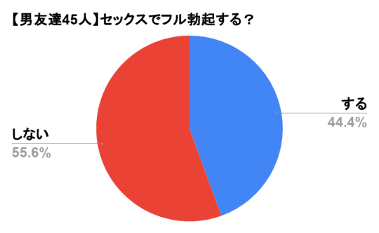 今回僕の男友達45人に、「セックスのときにフル勃起する?しない?」でリサーチしたところ、このような結果になりましたー!