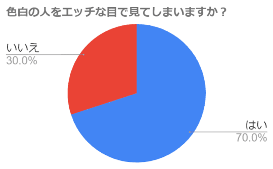 実際は世の男性たちはどう思っているのか知りたくて、20代30代の男性100人に聞いた「色白の子はエッチな子が多いと思うか?そう思わないか?」のアンケートに答えてもらい結果を元にグラフを作ってみました!