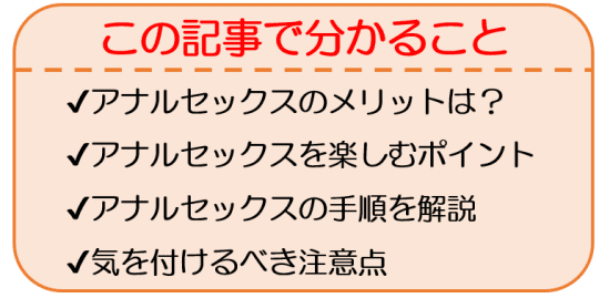 では、ここから実際に気になるやり方を解説します。アナルセックスは膣とは違い事前の準備が大切です。準備が不足だと痛みや不快感だけで快感になれません。早速、やり方を見ていきましょう!夫婦で協力しながら実践してくださいね。
