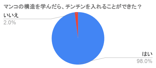 アンケートの結果、98%の男性が「マンコの構造を学んだら、すんなりとマンコに入れることができた」と答えてくれました。