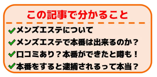 メンズエステで本番ができたなどの口コミを見かけることがありますが、果たして本当にメンズエステで本番できるのでしょうか?口コミの真相を確かめるとともに、回春性感マッサージとの違いや、逮捕されたケースについても触れていきます。