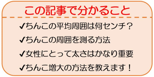 ちんこサイズというと長さばかりが語られがちですが、太さも重要ですよね?太いちんこでマンコを突き上げてイカせてみたいというのは男の野望。他の男のちんこの周囲も気になります。この記事では、ちんこの周囲の平均と、ペニス増大の方法を徹底解説いたします!