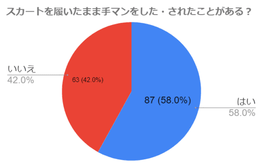スカートをしたまま手マンをしたりされたことがある人は、6割程度ということが分かります。少なくもなく多くもないといったところでしょうか。
