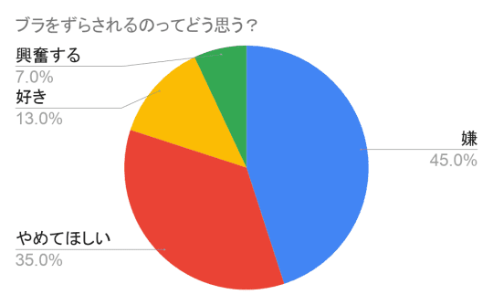 こちらの画像は、Twitterにて集まってくれた20~40代の女性100人に「ブラをずらされるのってどう思う?」とアンケートを取ったときのグラフを結果に表したもの。