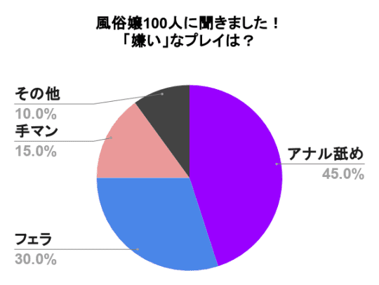 上のグラフは、私が通ったお店やセフレの風俗嬢100人にアンケートをとった結果です。なんと、「アナル舐め」が嫌いと答えた風俗嬢は45%!驚異的です、、、。