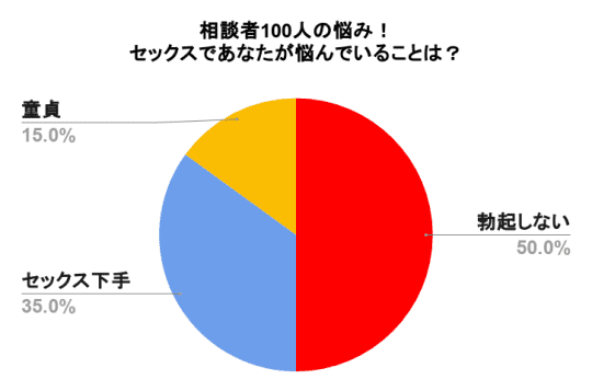 上のグラフは、私にセックスの相談をして下さった相談内容をまとめたものです!今回は100人に調査をしました。