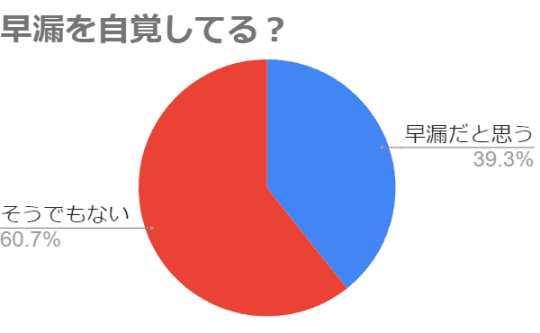 グラフを見てみると、全体の約40%の男性が早漏を自覚しているようです。早漏って自信にも繋がると思うので、そのせいでセックスに対して消極的にもなりやすいですよね。