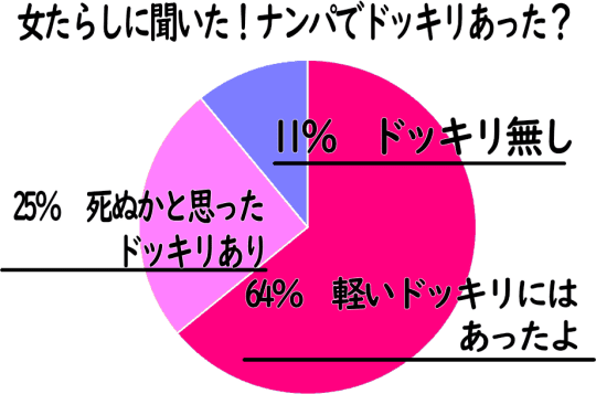 ナンパ中に軽いドッキリがあったと話してくれた男性は、64%もいました。「軽いドッキリ」とは言うけれど、私から見ると「軽くない」と思うこともちらほら。